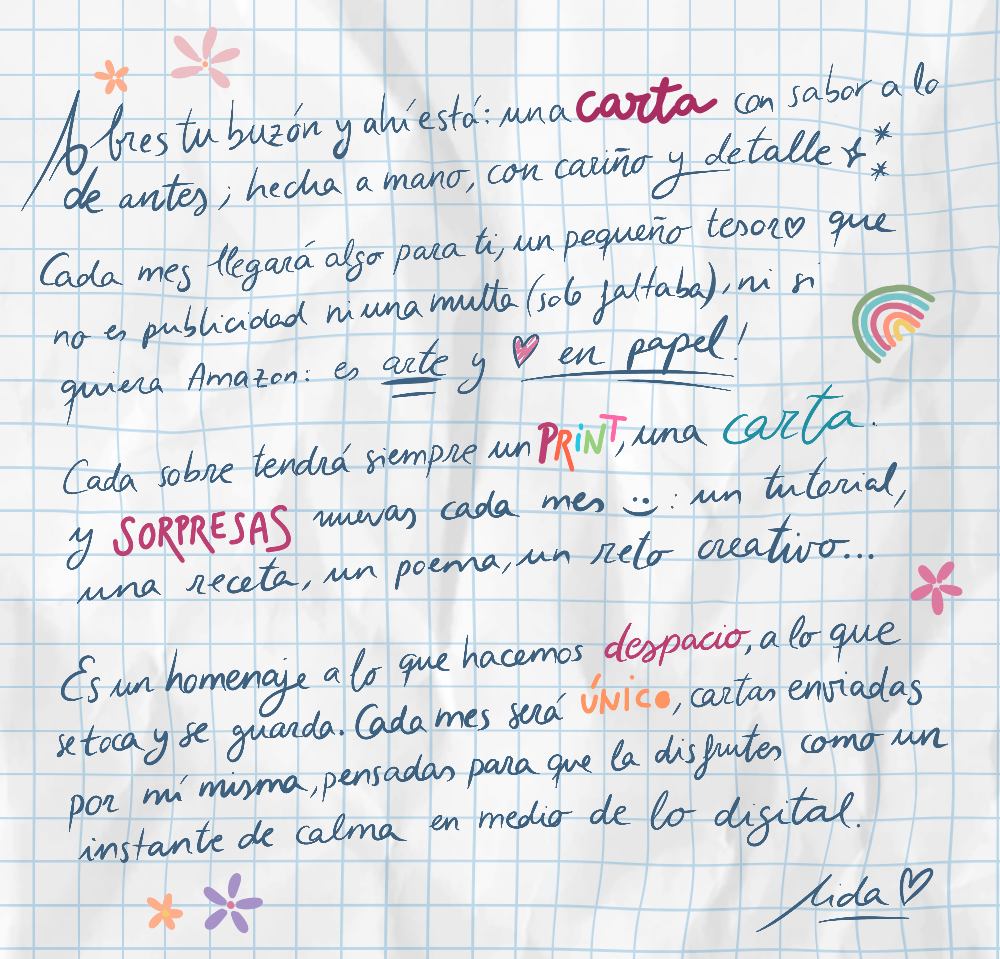 Es un homenaje a lo que hacemos despacio, a lo que toca y se guarda. Cada mes será único, cartas enviadas por mí misma, pensadas para que la disfrutes como un instante de calma en medio de lo digital.