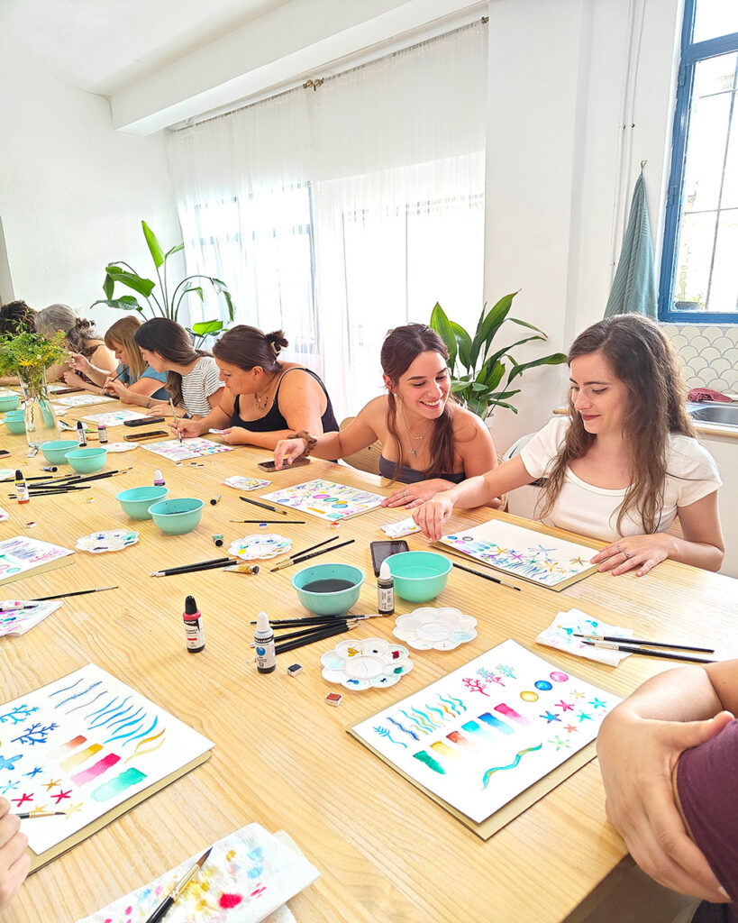 Trabajo con grupos reducidos (máximo 14 personas) para poder acompañarte de cerca, adaptándome a los distintos niveles y necesidades. Tanto si es tu primera vez como si ya has pintado antes, ¡te sentirás cómoda y cuidada!